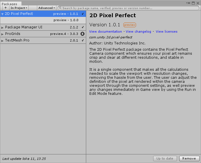 If you encounter any compile errors after importing the package, open the Package Manager window and ensure that you have installed packages that are compatible with the Unity version that you are using (e.g. 11.10.2020 the latest released 2D Pixel Perfect package version was 3.0.2 but the latest Unity 2019.1.8f1 compatible 2D Pixel Perfect packge version is 1.01 (preview)):
